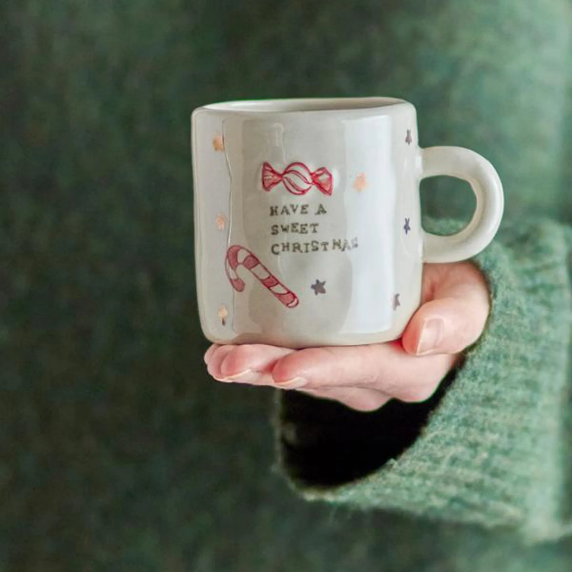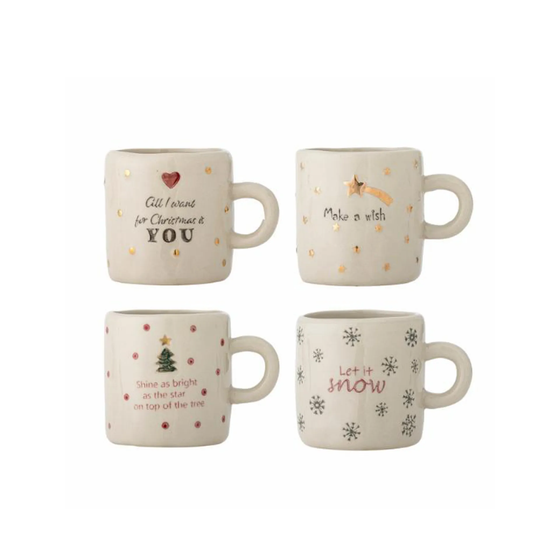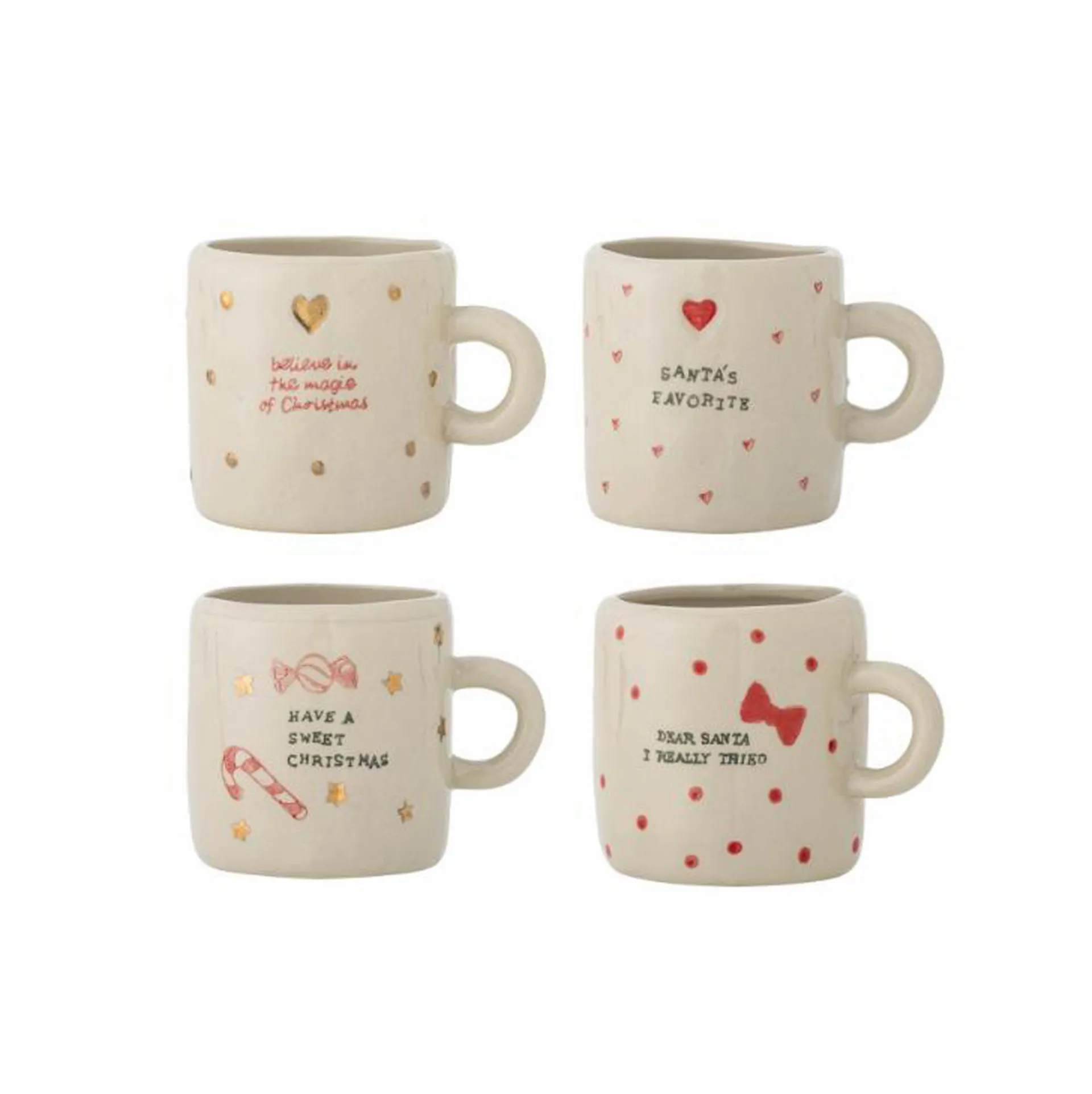 La Christy Cup di Bloomingville è un set di quattro tazze in gres con superficie dipinta a mano con elementi natalizi nei toni del rosso e dell'oro. Possono verificarsi variazioni nel motivo e nell'intensità del colore, rendendo ogni pezzo unico.