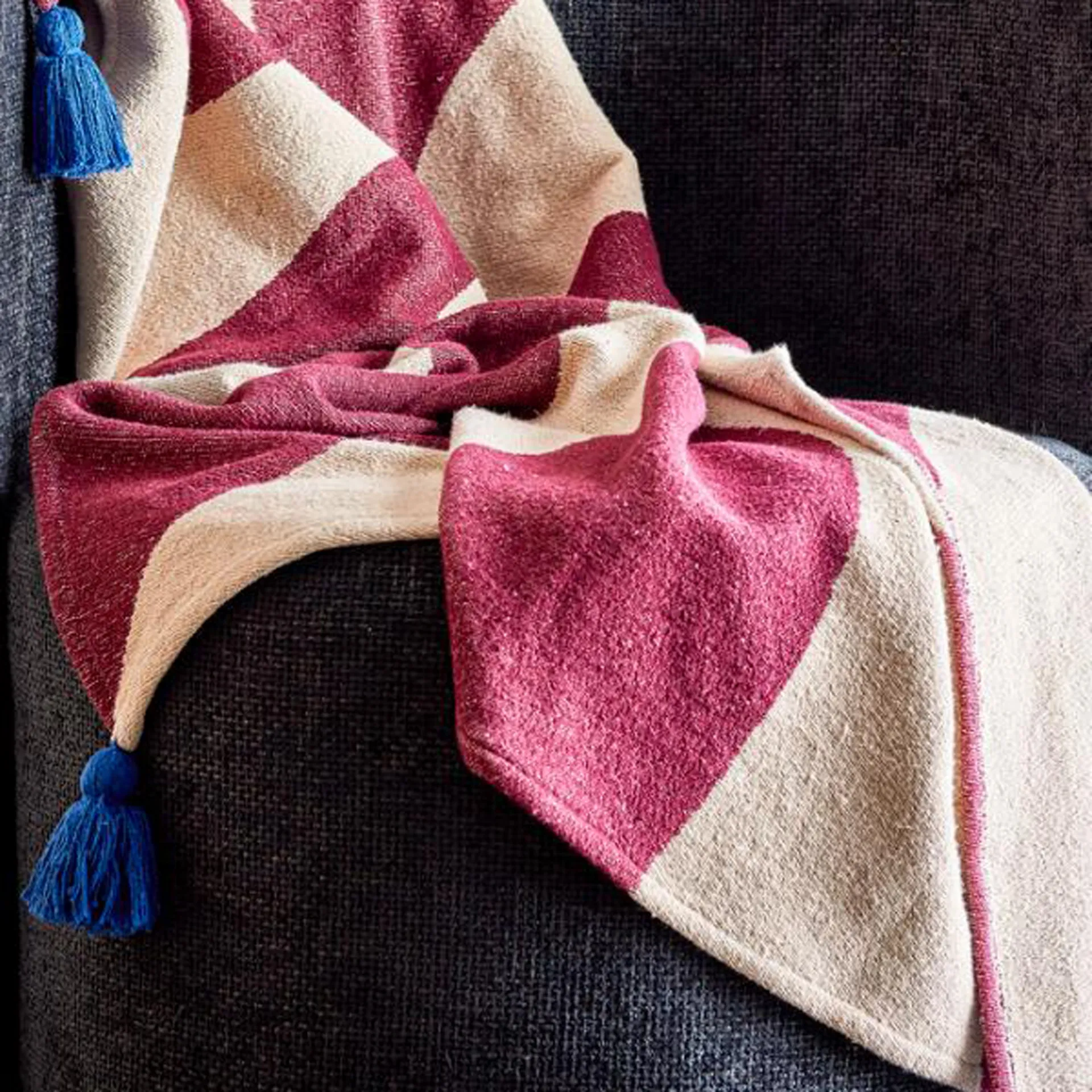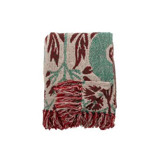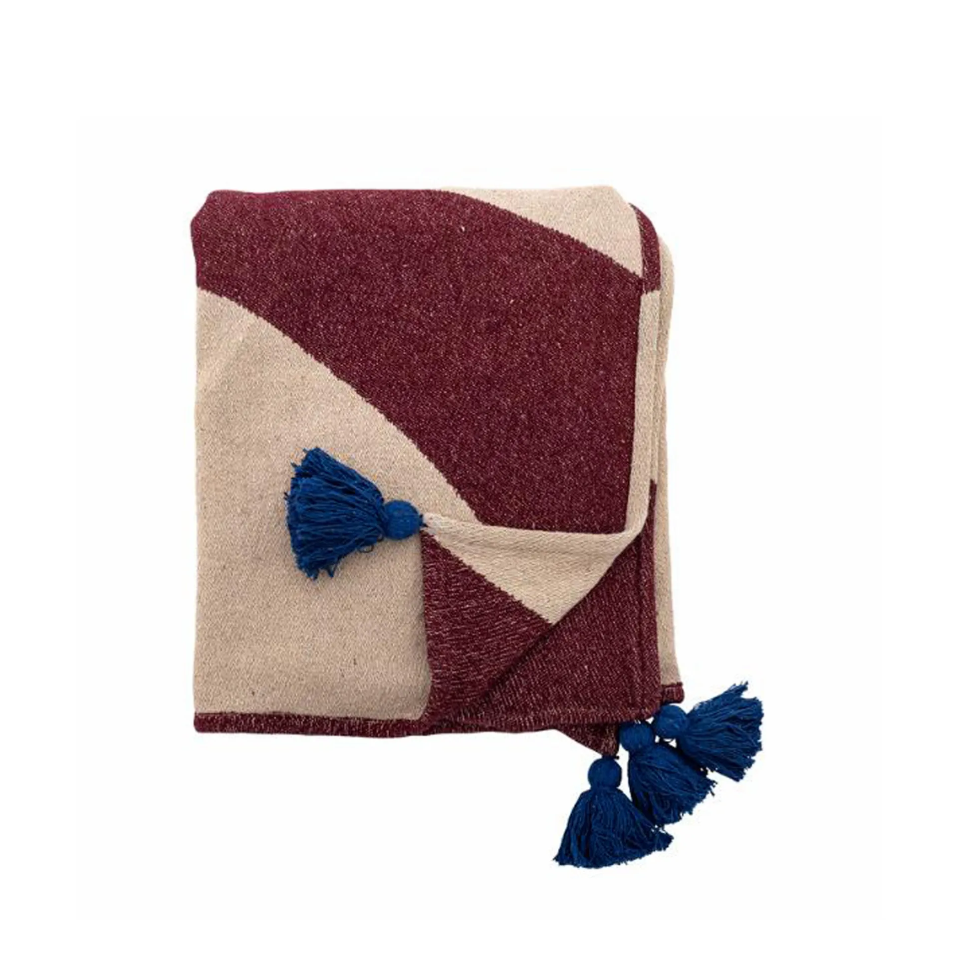 Il plaid Cimmi di Bloomingville è un plaid in tessuto jacquard nei toni del rosso intenso e del beige, con una superficie strutturata e nappe blu in ogni angolo.