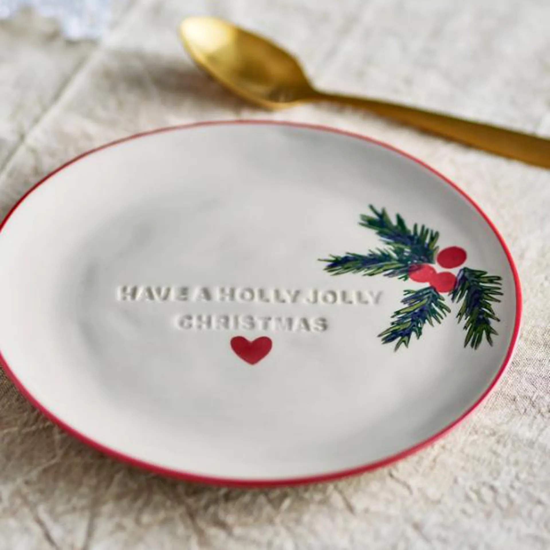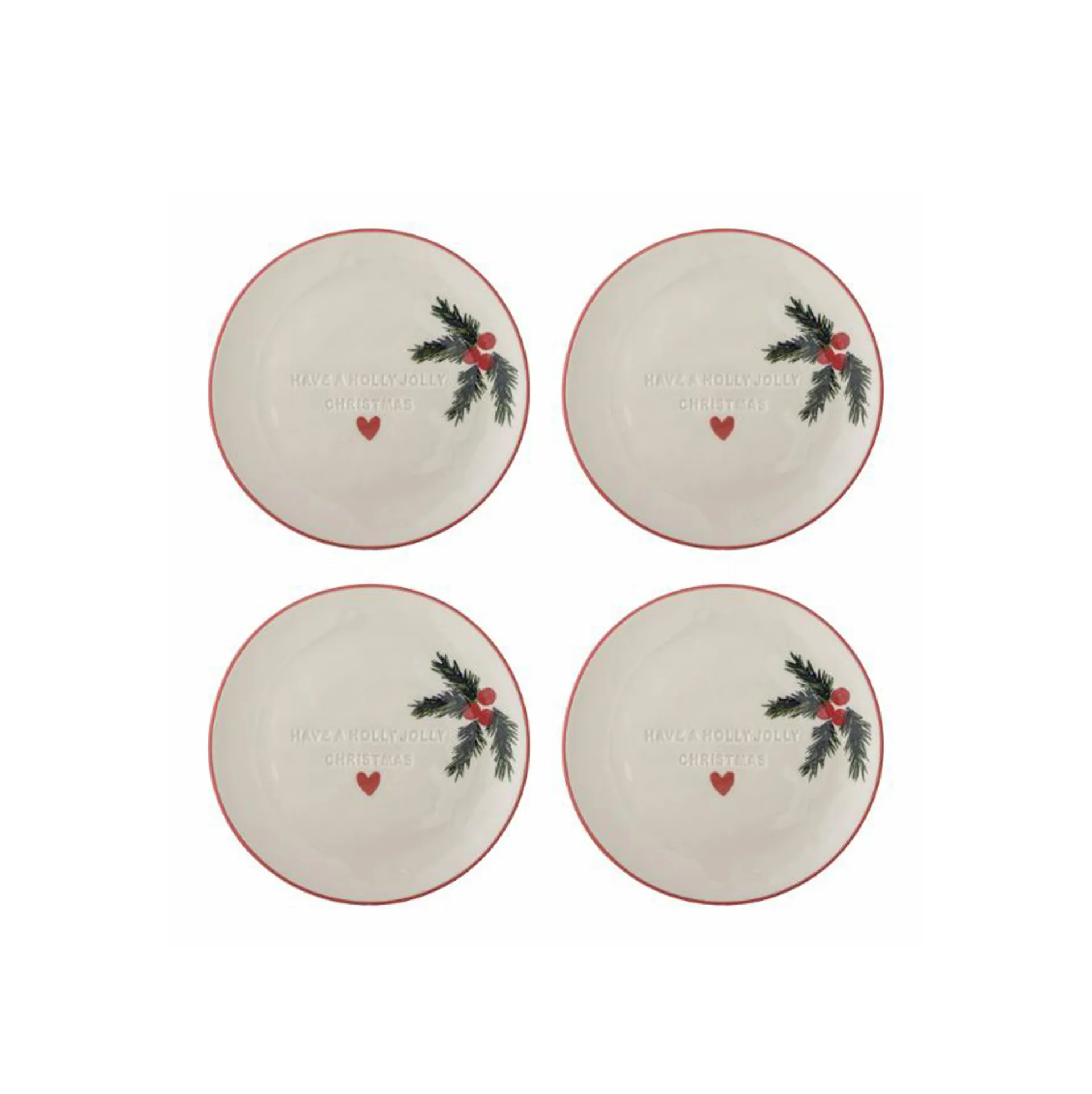 Il piatto Jovida di Bloomingville è un set di quattro piatti in gres beige con motivi festivi dipinti a mano e testo in rilievo. Possono verificarsi variazioni nel motivo e nell'intensità del colore, rendendo ogni pezzo unico.