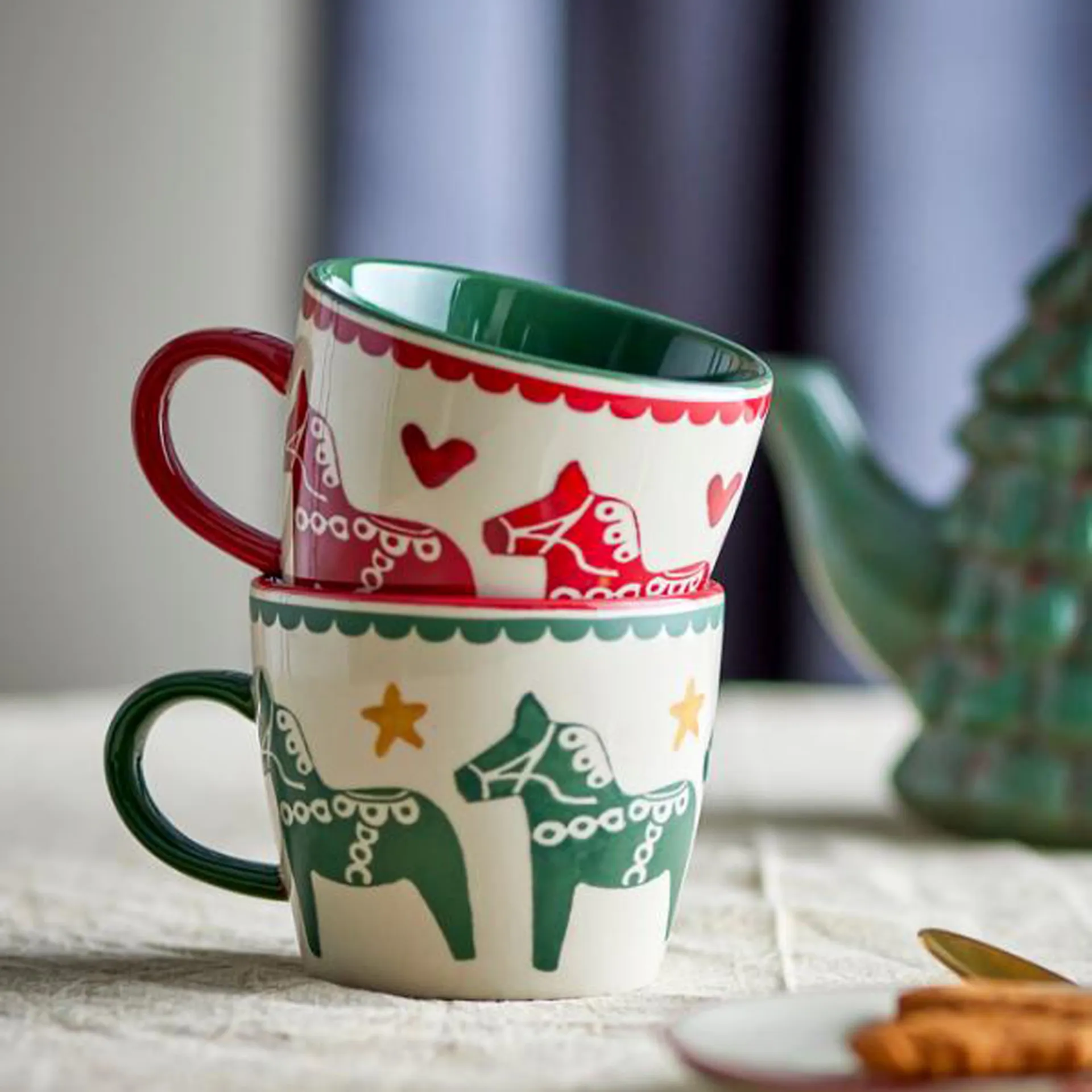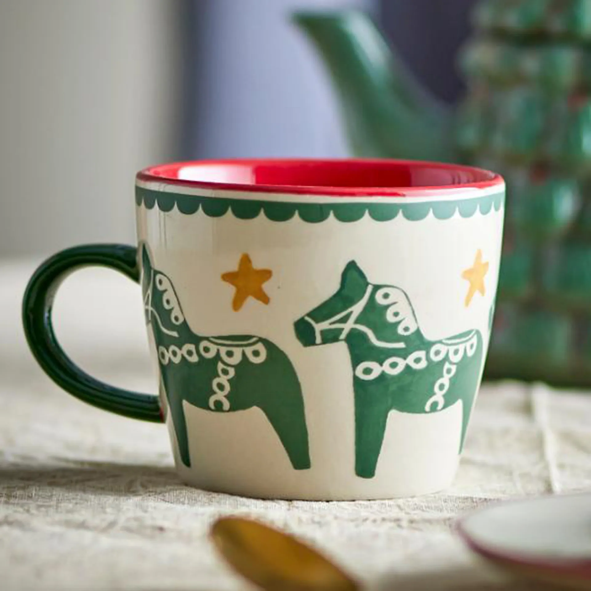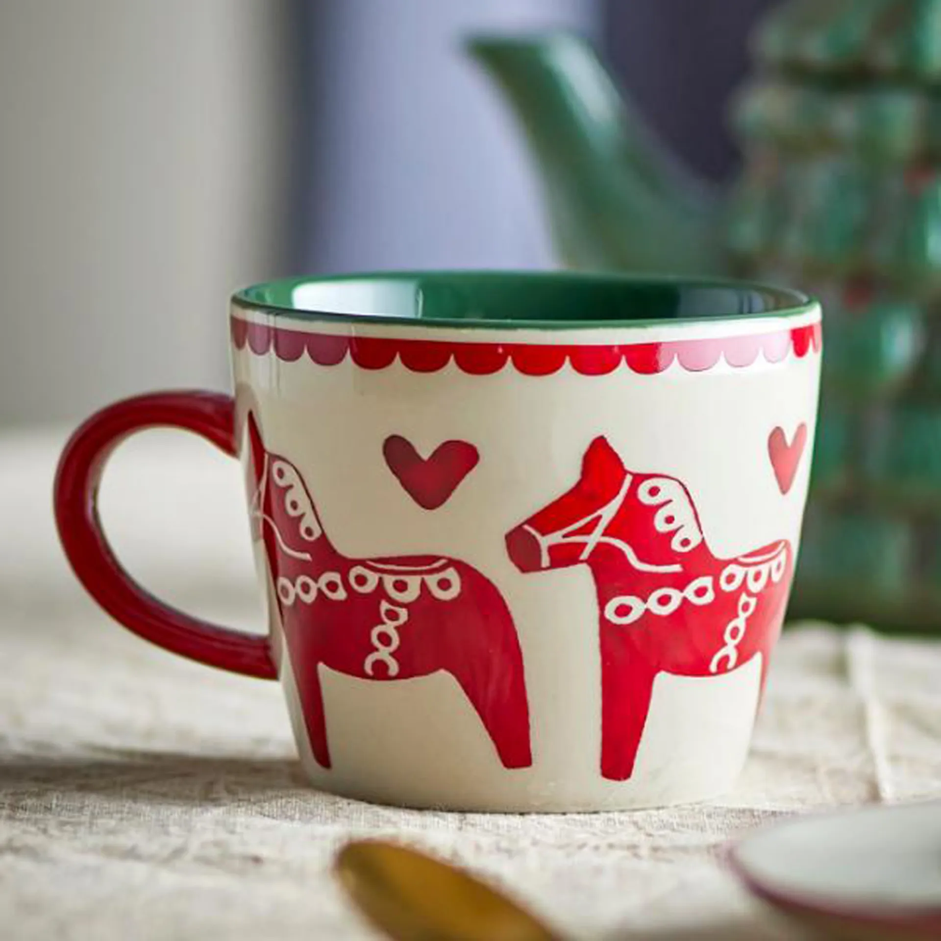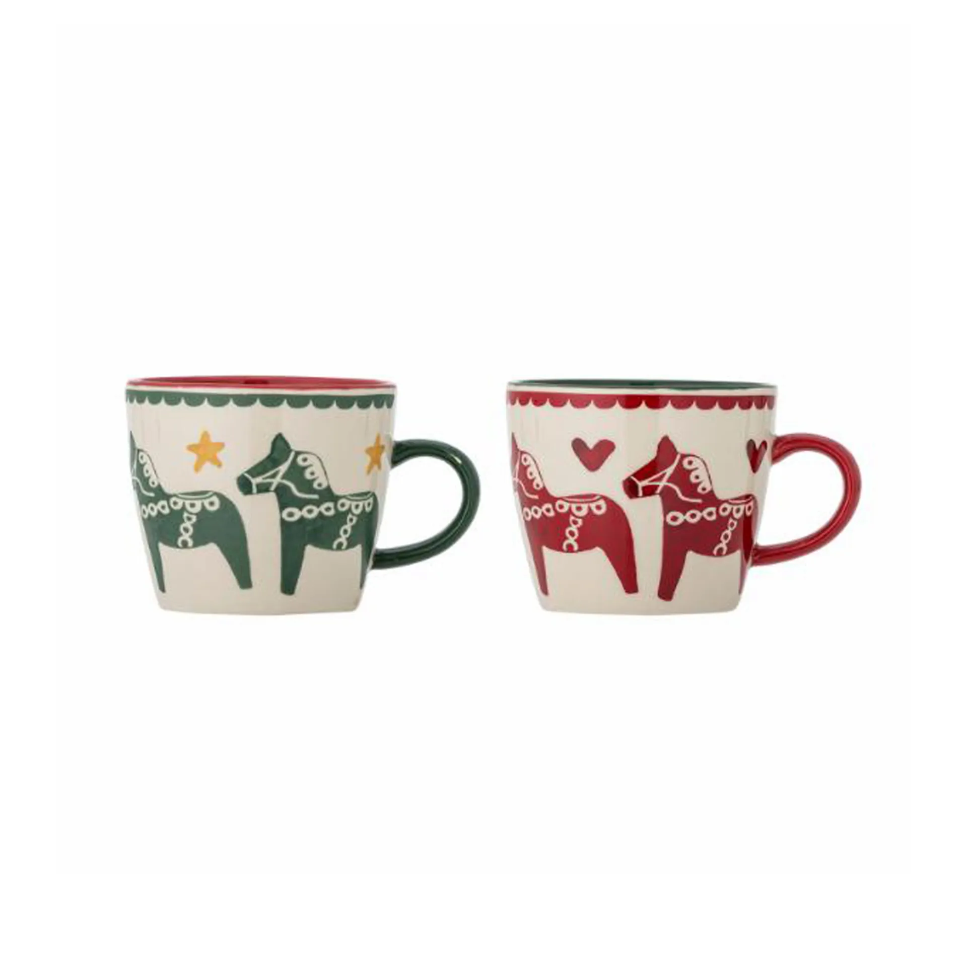 La tazza Siffer di Bloomingville è un set di due tazze in gres con base beige e decoro a decalcomania. Ogni tazza presenta un motivo a cavallo con bordi smerlati e colori interni a contrasto in tonalità festive.