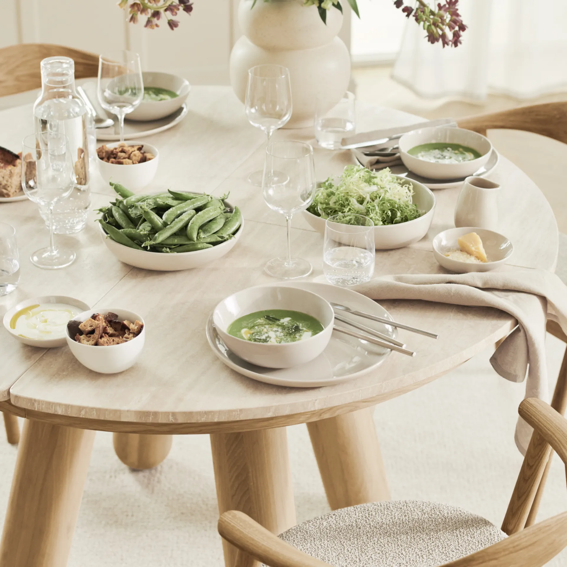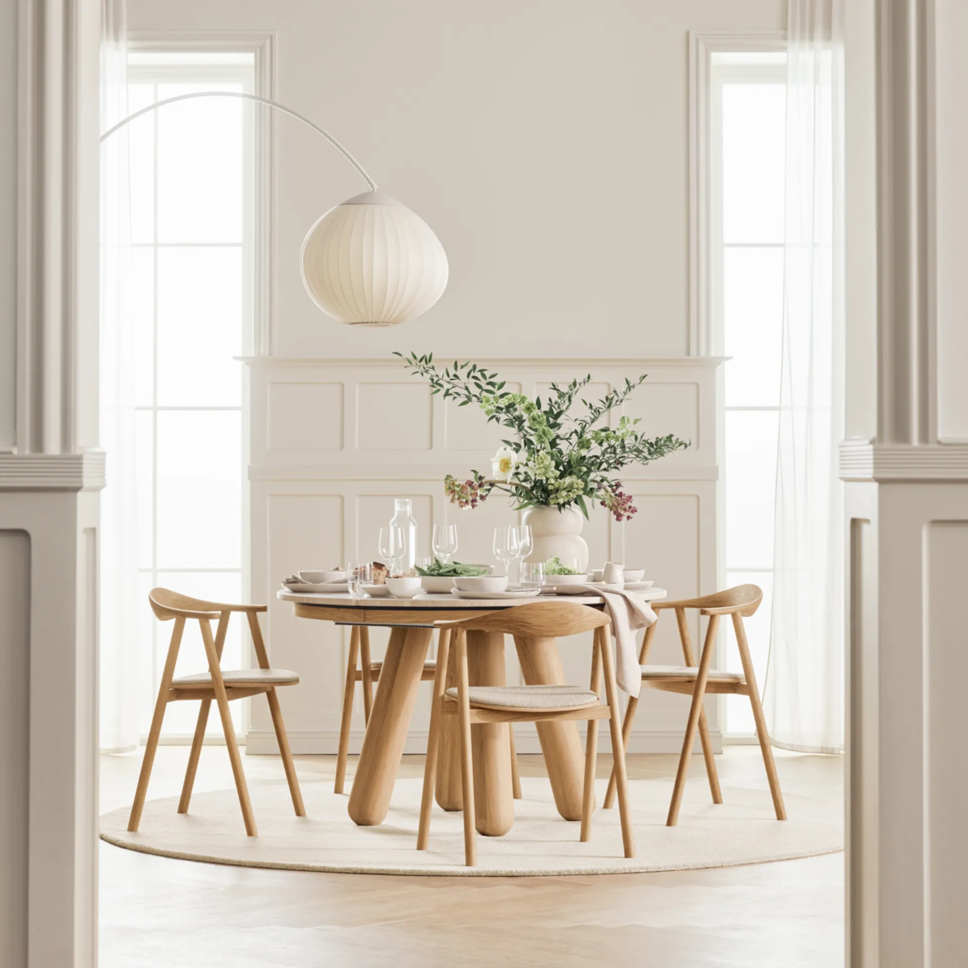 Il tavolo da pranzo Balance, disegnato da Michael H. Nielsen, unisce linee e linguaggio di design sofisticati con materiali organici eleganti. Le gambe robuste in legno di rovere certificato FSC™ fungono da base solida per il piano elegante in pietra il cui design è interrotto unicamente dalle assi prolunga in legno massello di rovere. Un tavolo da pranzo dalle proporzioni e dettagli raffinati che non passa di certo inosservato.