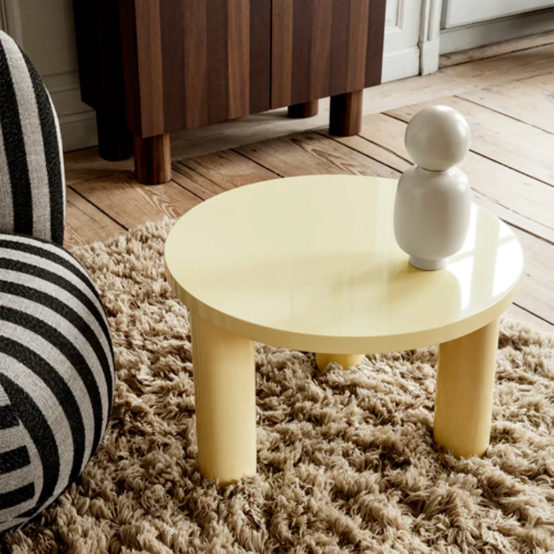 Ispirato al brutalismo, il tavolino Post presenta un design rotondo e semplice che cattura l'attenzione. Realizzato in legno certificato FSC™ con una finitura lucida, questo tavolino caratteristico è disponibile in diversi colori tenui e presenta tre robuste gambe cilindriche.