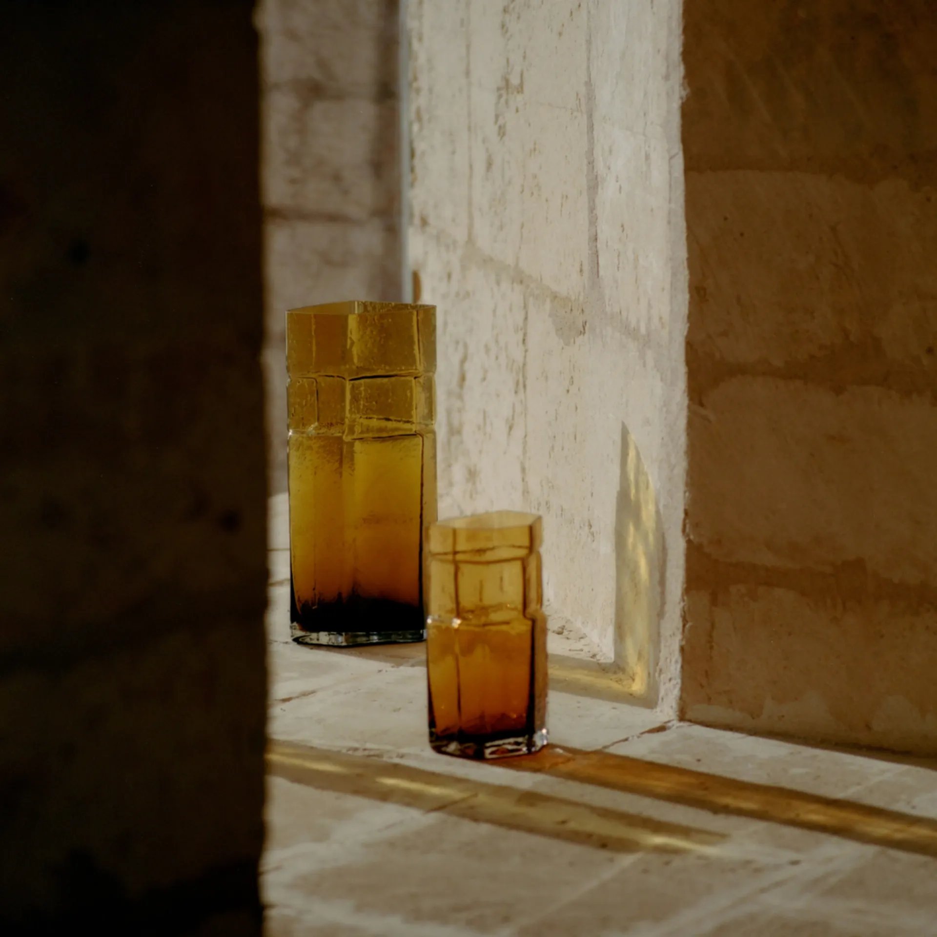 La serie Muro prende il nome dalla parola spagnola che significa muro, in riferimento alle sue origini architettoniche e al legame con Can Lis. Questo trio di vasi in vetro riciclato soffiato a bocca, ognuno con dimensioni e forme diverse, trae ispirazione dalla consistenza e dalla struttura dei mattoni. Modellati utilizzando stampi ricavati da veri mattoni, i vasi incarnano sottili sfumature architettoniche, mentre il processo di soffiatura a bocca conferisce un carattere artigianale a ogni pezzo.