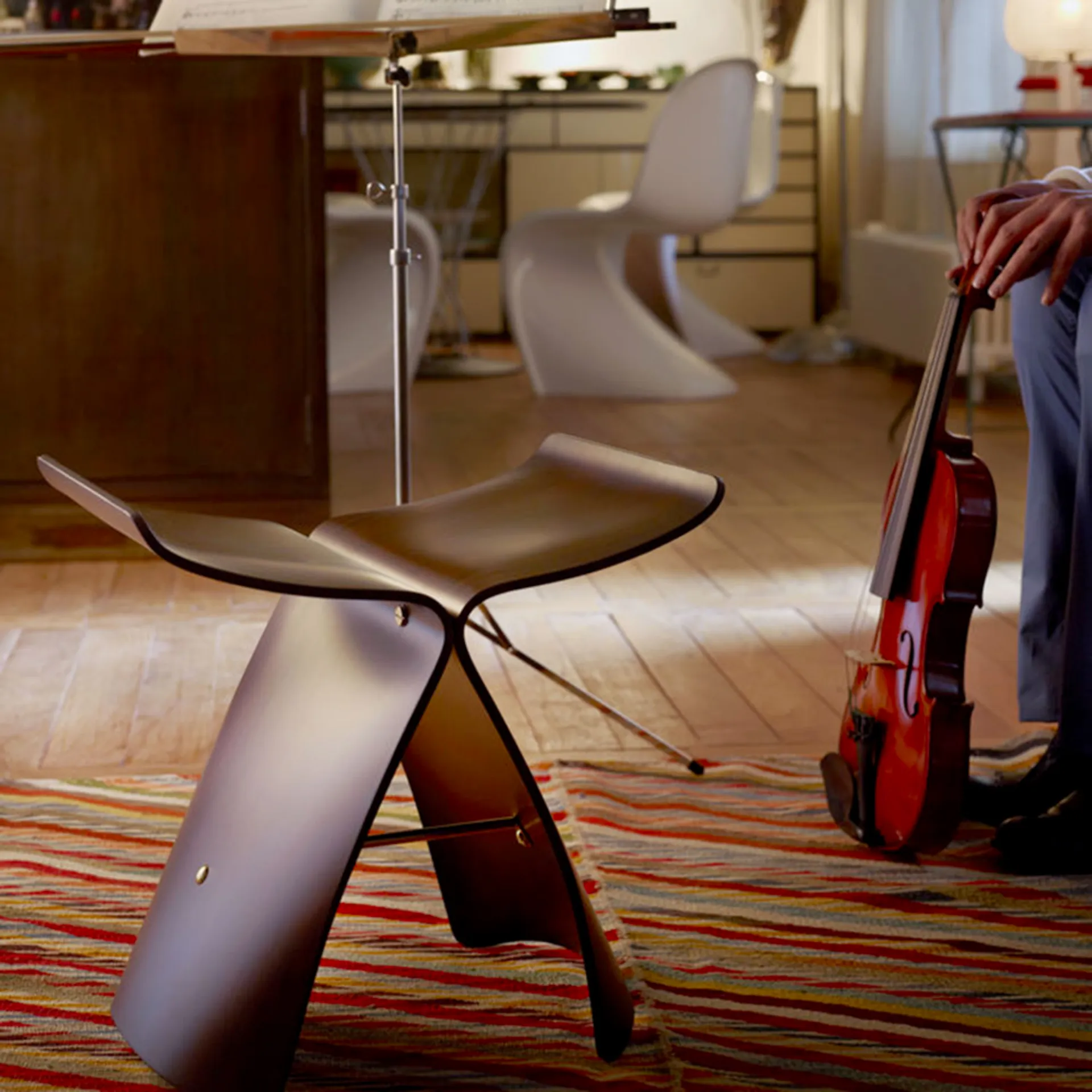 Sori Yanagi. Yanagi combinò la tradizione artigianale giapponese con i principi del design moderno per creare un pezzo di arredamento unico e senza tempo. Il segno distintivo dello sgabello è la sua forma curva simmetrica, che ricorda le ali di una farfalla, da cui deriva il nome. Realizzato in legno di palissandro o di betulla, lo sgabello è assemblato senza l'uso di chiodi o viti.